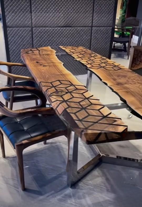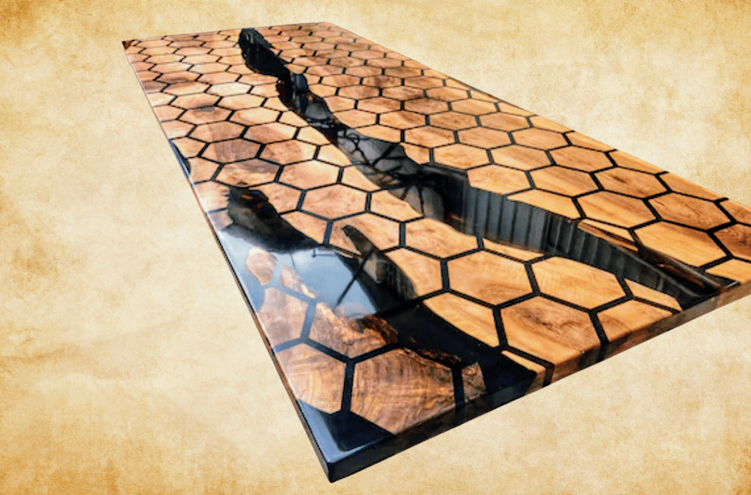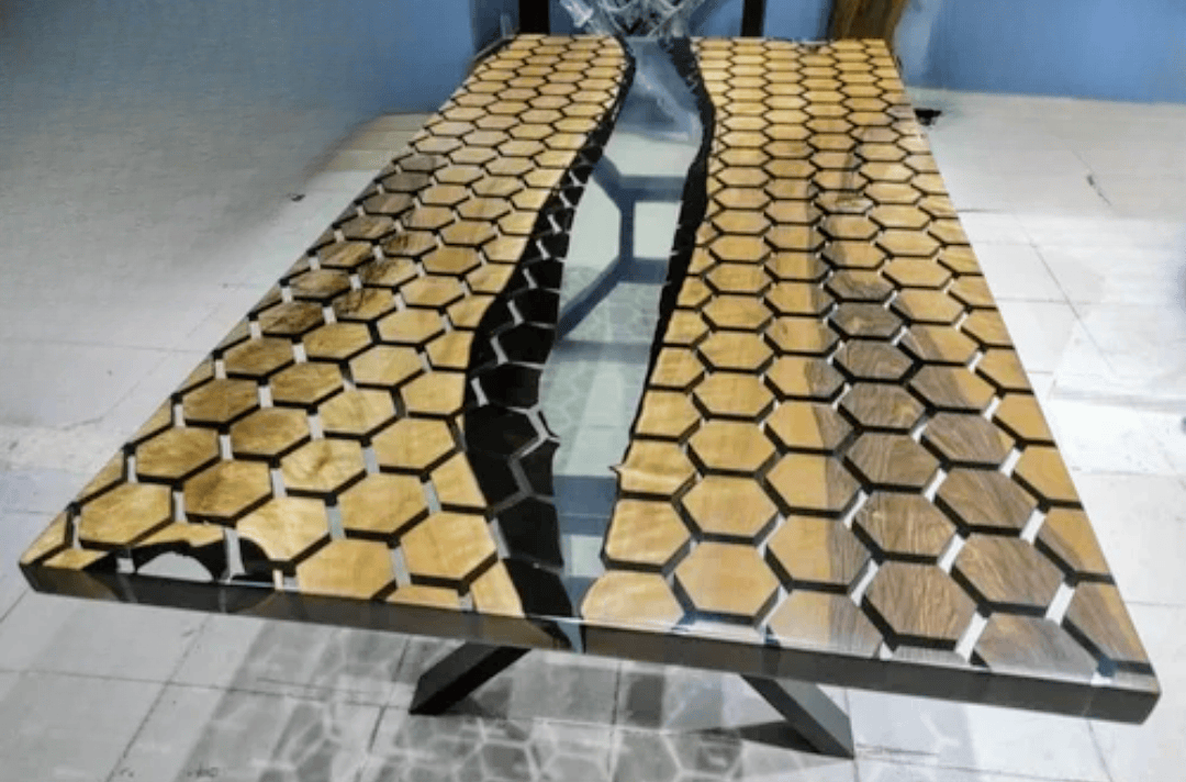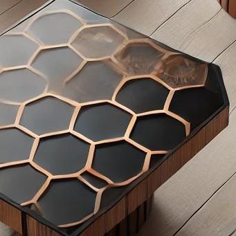 The crystalline panel table combines the warmth of wood with the clarity of epoxy resin. Wooden hexagons are intertwined with a river of crystalline resin, creating a mesmerizing visual effect. A centerpiece that will transform any space