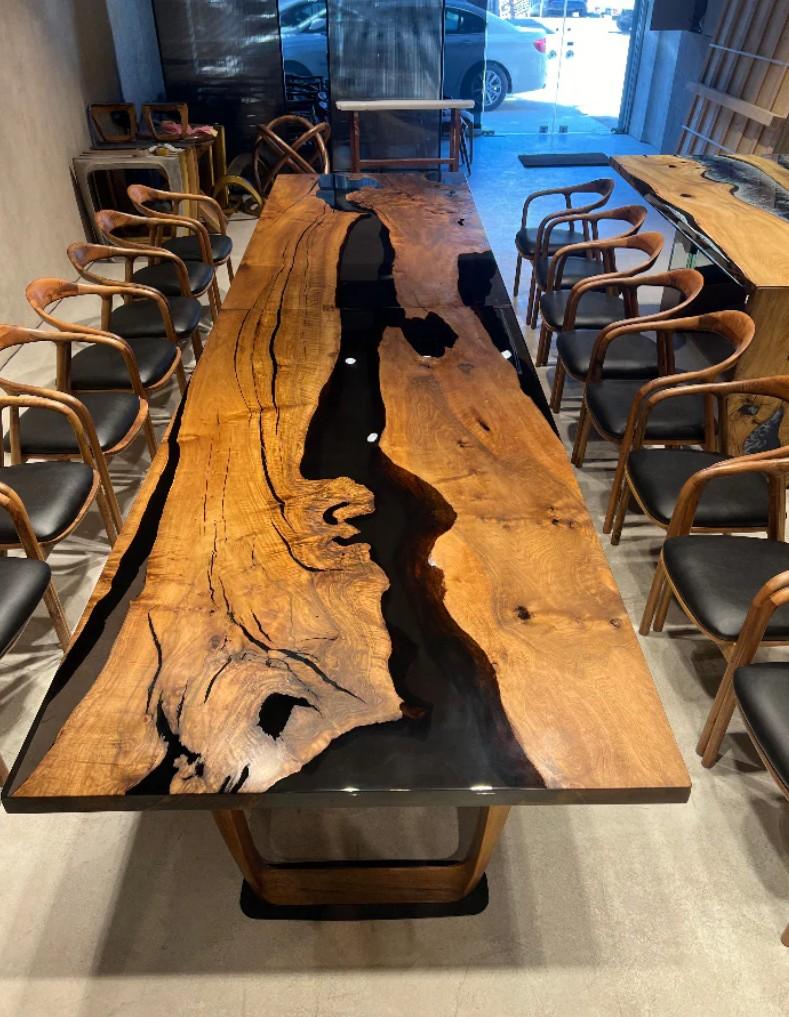 This conference table evokes the serenity of a natural landscape, where the fluidity of the dark resin simulates a winding river through the robust wood. Its contemporary design and distinctive character inspire creativity and dialogue in any professional setting