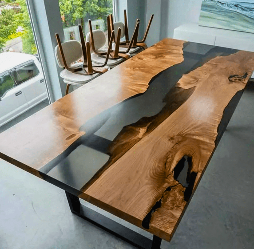 An exclusive piece where natural wood and epoxy resin combine to create a river effect with a shiny and elegant finish. Its unique design highlights the organic beauty of wood with a modern and sophisticated touch.