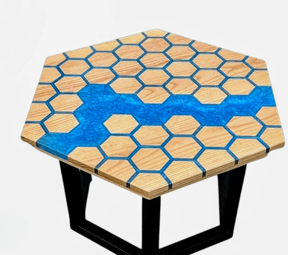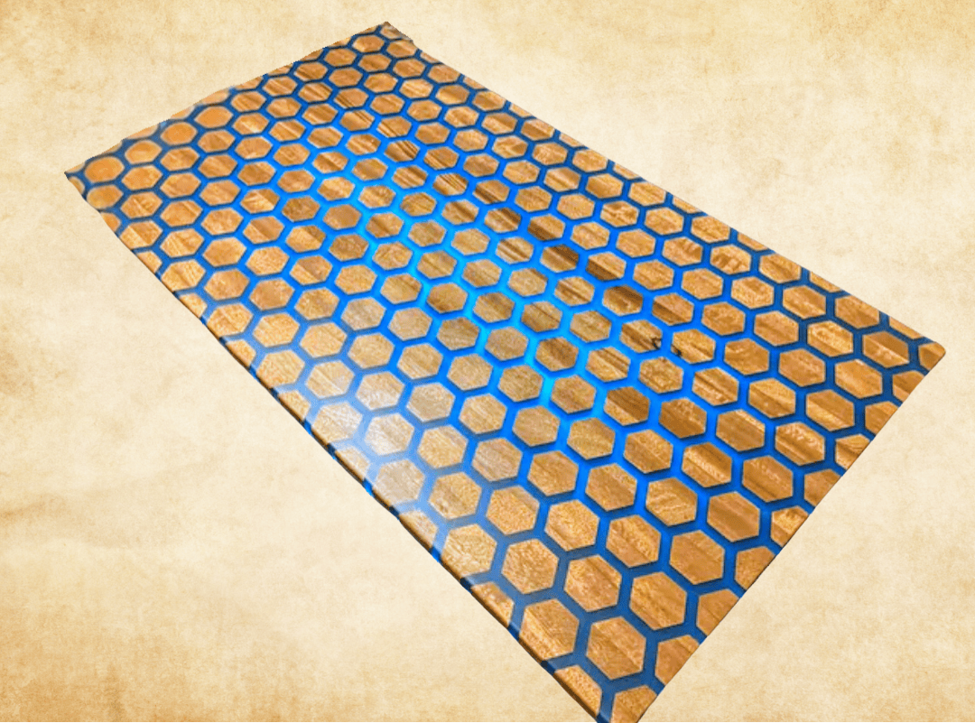 The “Blue Honey” table features a wooden surface with a hexagonal pattern that evokes the structure of a honeycomb. The wood, with its warm honey tone and natural grains, contrasts beautifully with the blue epoxy resin that fills the hexagons. This resin, with its glossy and translucent finish, creates a deep and attractive visual effect, as if blue light is trapped inside the table. The combination of natural wood and blue resin brings a modern and sophisticated touch, making this table a striking centerpiece in any space. Ideal for living rooms, dining rooms or creative workspaces, the “Blue Honey” table is a fusion of functionality and art, offering a unique and memorable visual experience.
