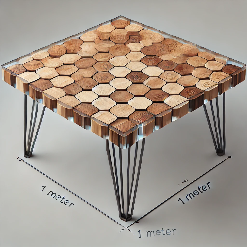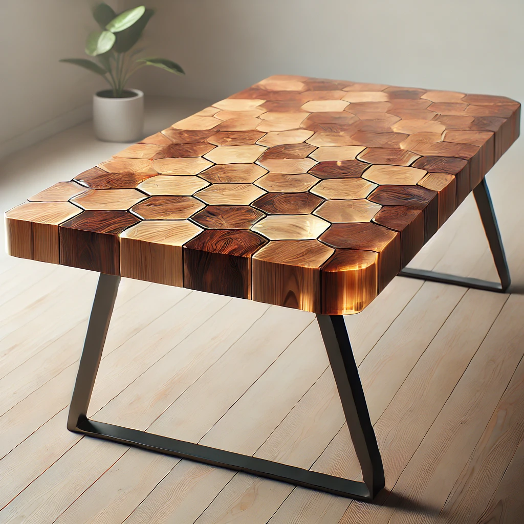 The “Square Honeycomb” table is a contemporary design piece that combines the warmth of wood with an industrial touch. This table has a surface composed of wooden hexagons of different grains, creating a visually attractive and dynamic mosaic. The transparent epoxy resin, which fills the spaces between the hexagons, provides a glossy finish and protects the surface. The metal legs, with their minimalist design and clean lines, complement the surface, providing stability and an industrial touch. Ideal as a coffee table, side table or centerpiece in any space, the “Square Honeycomb” table is a fusion of art and functionality, offering a unique and memorable visual experience.