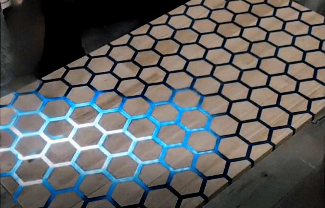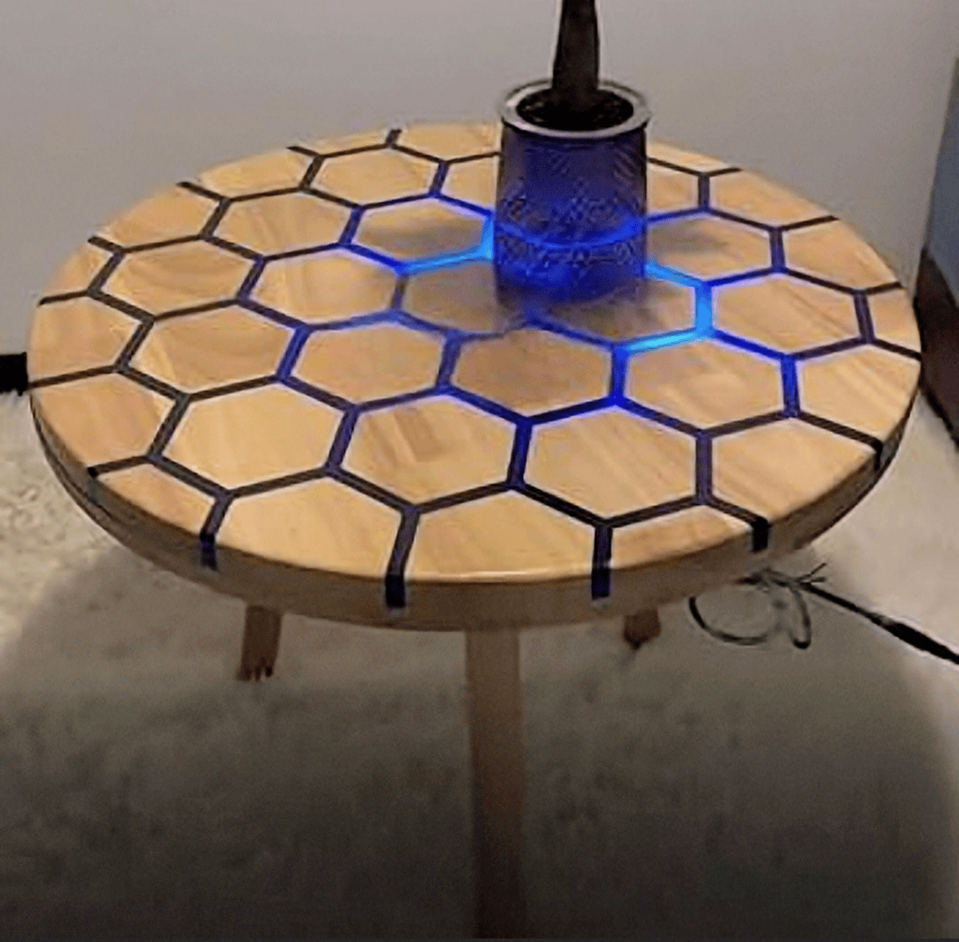 The “Nest of Light” table is a piece of furniture that fuses the warmth of solid wood with the modernity of epoxy resin and LED lighting. Its hexagonal design, inspired by honeycombs, creates a visually appealing and dynamic pattern. The epoxy resin, with its glossy and translucent finish, highlights the natural beauty of the wood and protects its surface, perfect for creative workspaces or as a centerpiece in a modern living room