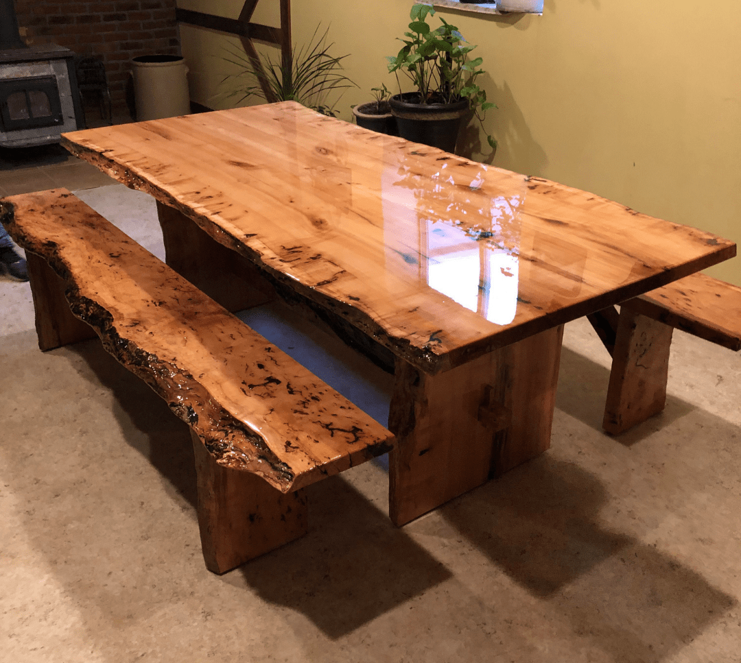 This table and benches set merges the natural beauty of the wood’s sinuous edges with a glossy finish that enhances its texture and color. Its robust yet refined design invites you to enjoy outdoor meals or informal gatherings with a touch of rustic distinction.