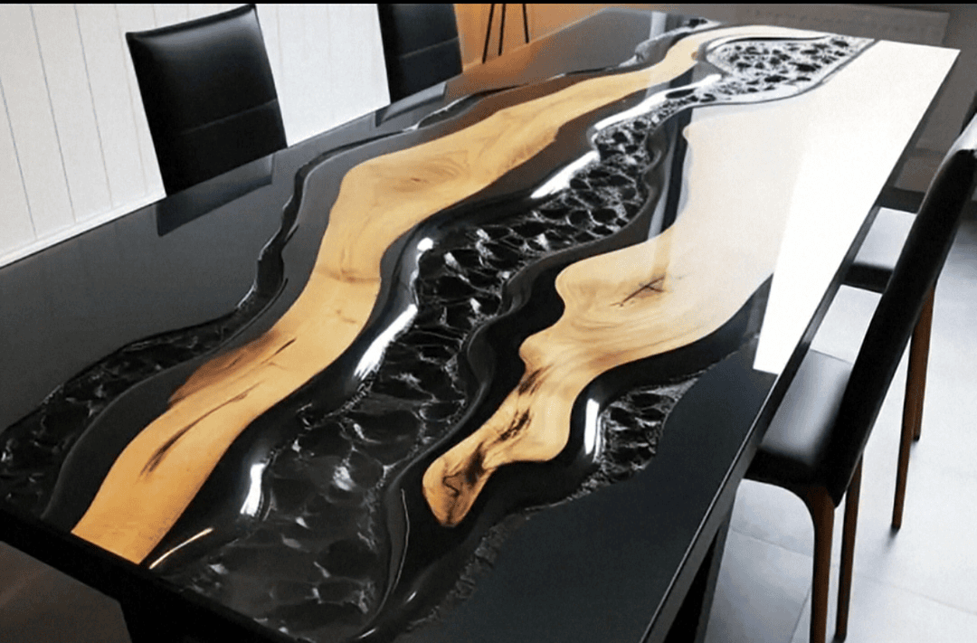 A functional piece of art that fuses the natural elegance of wood with the mystical depth of black epoxy resin. The fluid design evokes the silhouette of a moving river, with textured details that provide a unique three-dimensional effect. The light wood contrasts with the intense black, highlighting the organic grains and shapes of each piece. Perfect for sophisticated spaces looking for exclusivity and distinction.