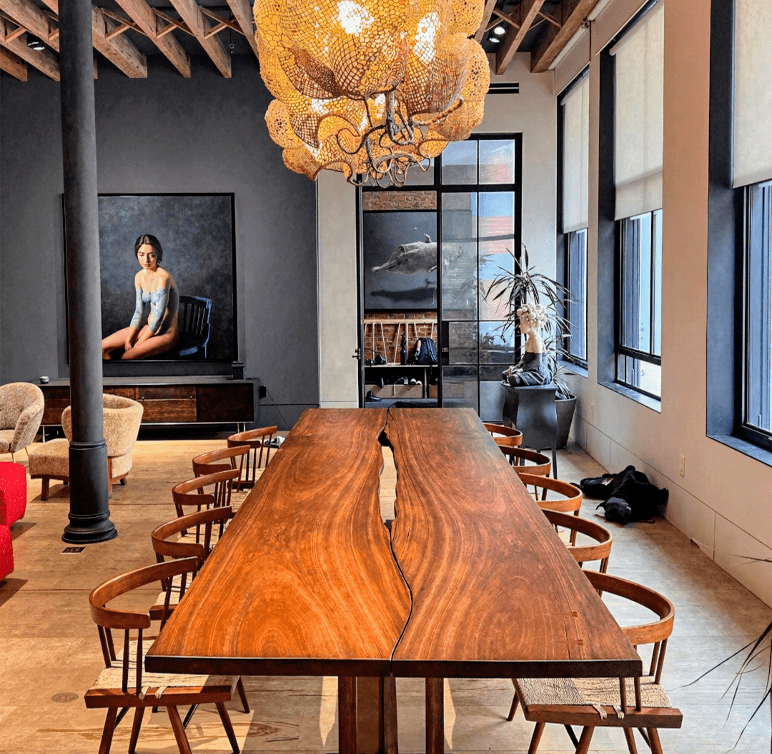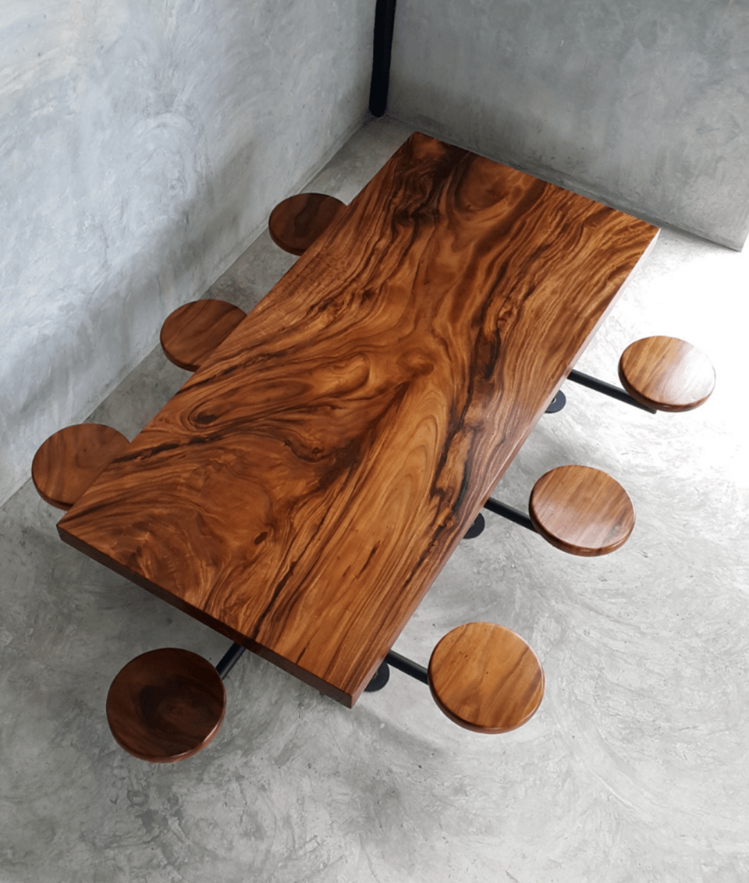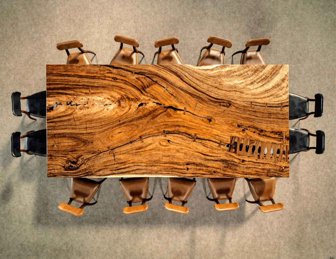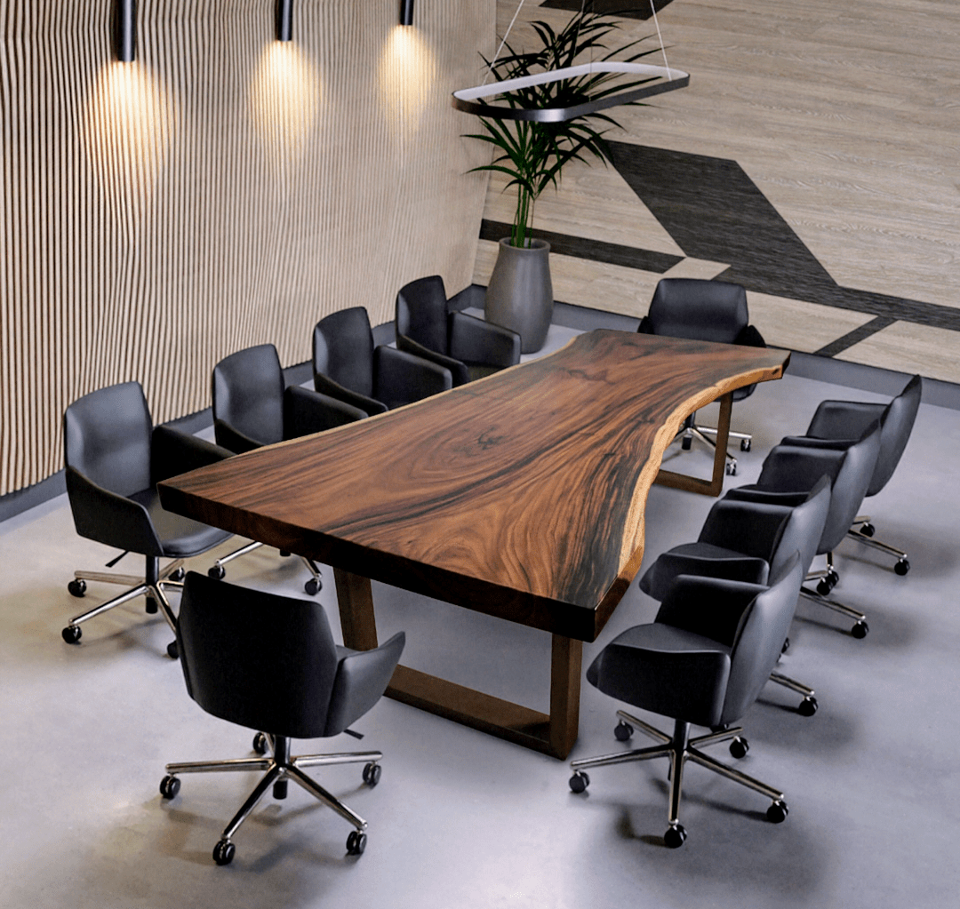 A meeting table that celebrates the organic beauty of wood in its purest state. Its irregular edges and the richness of its grain tell a natural story, bringing a touch of authenticity and character to any creative or executive workspace.
