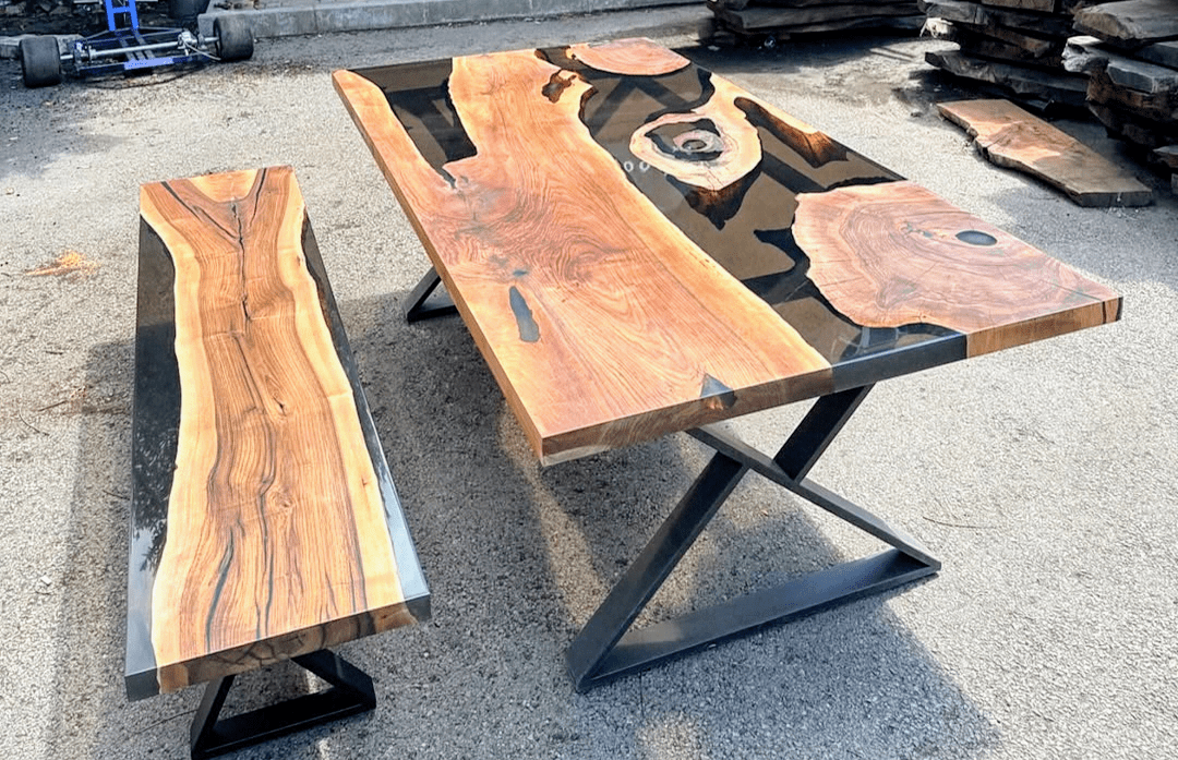 This elegant set features the same striking combination of warm wood and dark resin from the “Fluid Night” table, now complemented by a matching bench. The continuity of the design in both elements creates a captivating visual harmony, offering not just a sophisticated table but a complete experience of style and comfort for your spaces. Acquire the set and elevate the aesthetic of your environment to the next level.