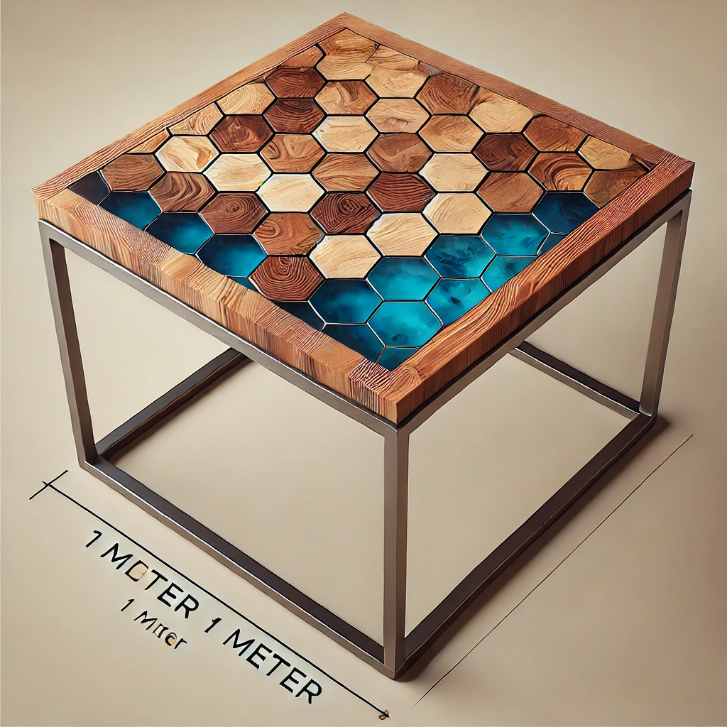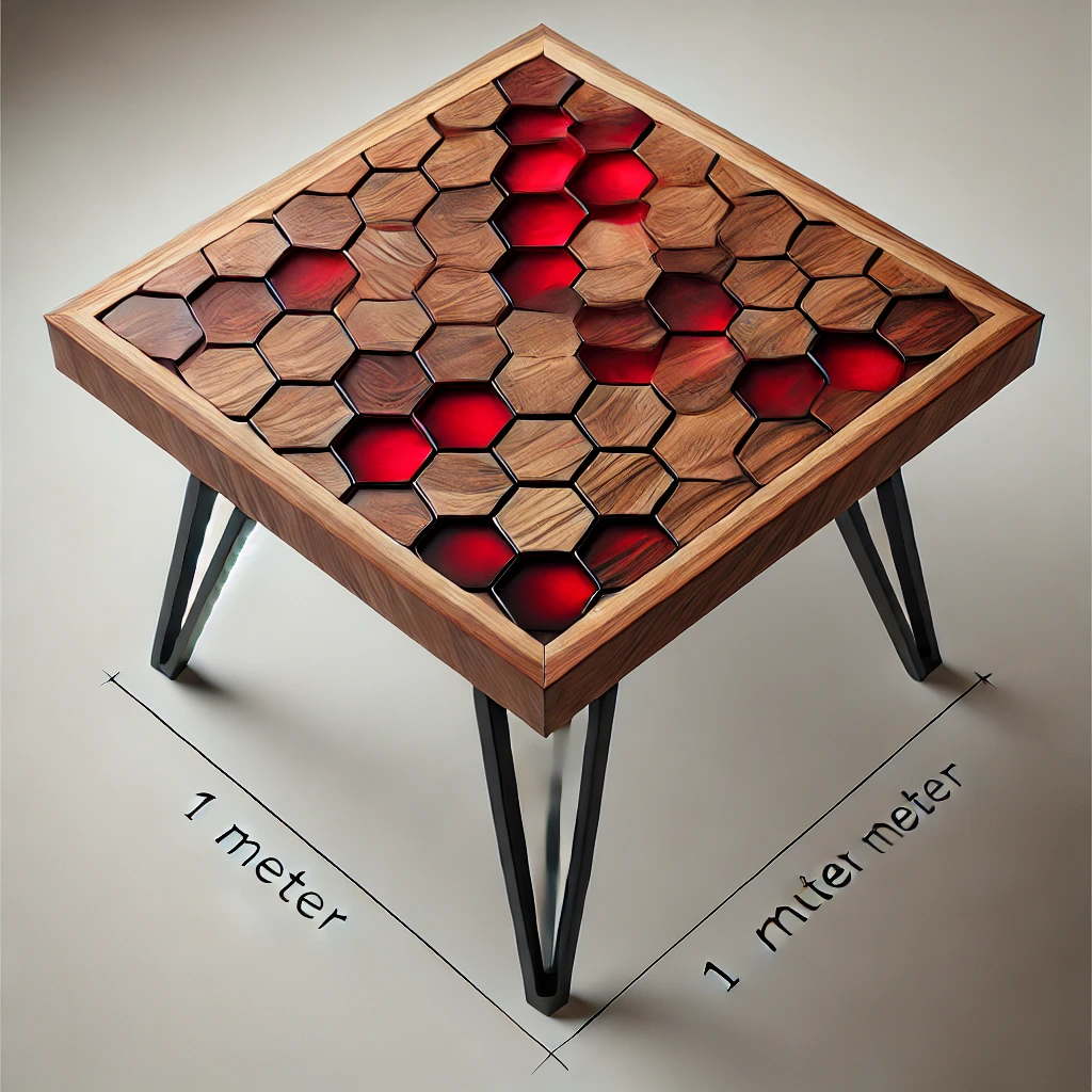 The “Ruby Honeycomb” table is a contemporary design piece that combines the warmth of wood with a touch of intense color and sophistication. With dimensions of 1 meter by 1 meter, this table has a surface composed of wooden hexagons of different grains, creating a visually attractive and dynamic mosaic. The red epoxy resin, which fills a section of the surface, brings a touch of deep color and a glossy finish, creating a striking contrast with the wood. The metal legs, with their minimalist design and clean lines, complement the surface, providing stability and a modern touch. Ideal as a coffee table, side table or centerpiece in any space, the “Ruby Honeycomb” table is a fusion of art and functionality, offering a unique and memorable visual experience.