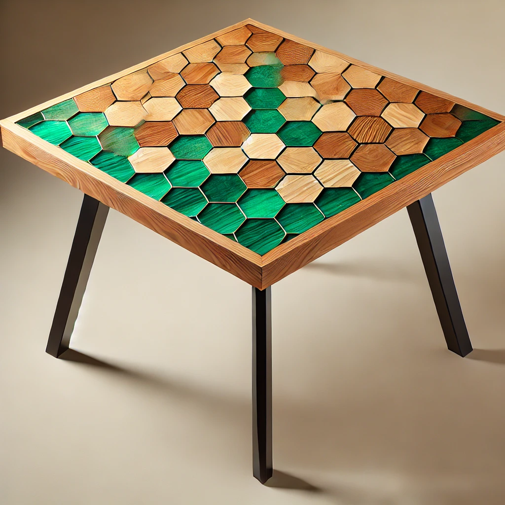 The “Emerald Honeycomb” table is a contemporary design piece that combines the warmth of wood with a touch of vibrant color and elegance. The table top is composed of wooden hexagons of different shades and grains, creating a visually appealing and dynamic mosaic. The emerald green epoxy resin, which fills a section of the surface, provides a touch of intense color and a glossy finish, creating a striking contrast with the wood. The metal legs, with their minimalist design complement the surface, providing stability and a modern touch. Ideal as a coffee table, side table or centerpiece in any space, the “Emerald Honeycomb” table is a fusion of art and functionality, offering a unique and memorable visual experience.